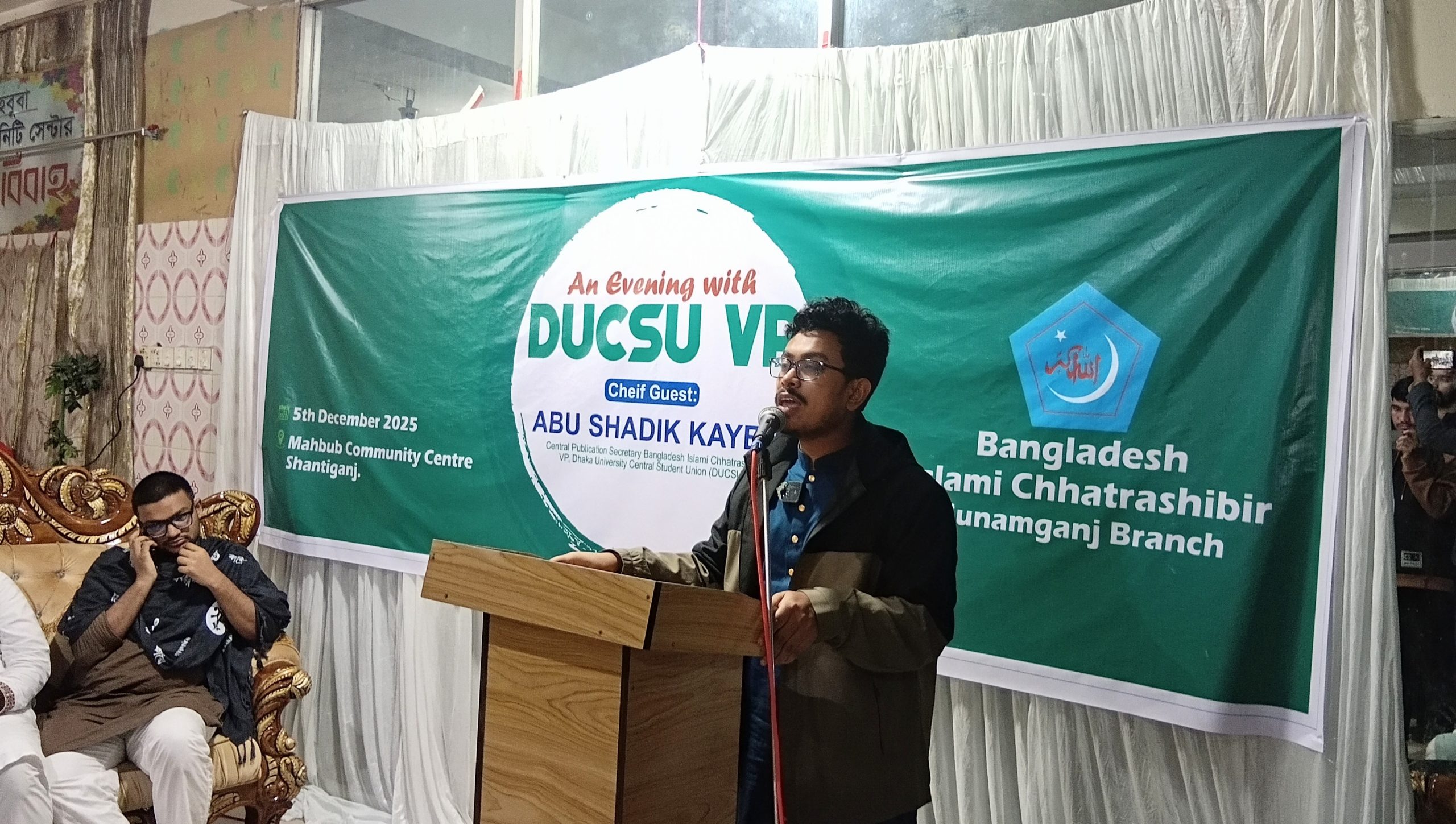 শুক্রবার (৫ ডিসেম্বর) সন্ধ্যায় শান্তিগঞ্জ বাজার এলাকার মাহবুবা কমিউনিটি সেন্টারে আয়োজিত এ অনুষ্ঠানে প্রধান অতিথি ছিলেন ঢাকসু ভিপি আবু সাদিক কায়েম।