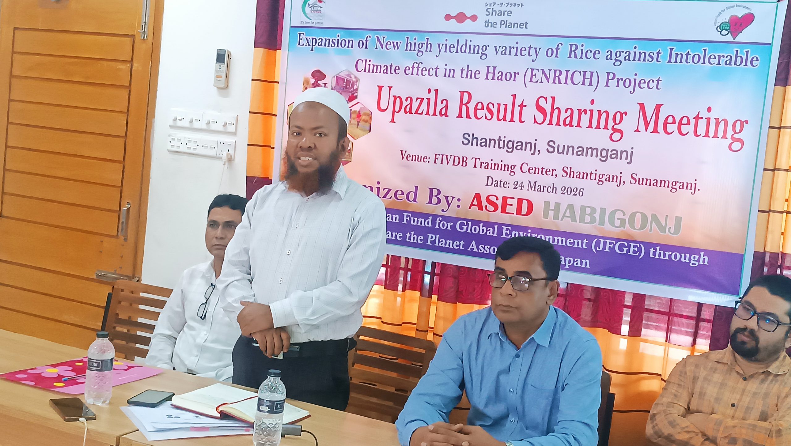 সুনামগঞ্জের শান্তিগঞ্জে বেসরকারী উন্নয়ন সংস্থা এসেড হবিগঞ্জ এর আয়োজনে এফআইভিডিবি ট্রেনিং সেন্টারে ২৪ শে মার্চ ২০২৬ এনরিচ প্রকল্পের উপজেলা রেজাল্ট শেয়ারিং সভা অনুষ্ঠিত হয়েছে। এসেড হবিগঞ্জের প্রোগ্রাম ম্যানেজার নির্মল কুমার বিশ্বাস এর সভাপতিত্বে উক্ত সভায় প্রধান অতিথি ছিলেন ব্রি আঞ্চলিক কার্যালয় প্রধান ও সুনামগঞ্জ ধান গবেষণা কেন্দ্রের উর্ধ্বতন বৈজ্ঞানিক কর্মকর্তা ড. মোঃ রেজওয়ান ভূইয়াঁ, বিশেষ অতিথি হিসেবে উপস্থিত ছিলেন উপজেলা যুব উন্নয়ন কর্মকর্তা জনাব সন্ধীপ বিশ্বাস, আরপিডব্লিউএস এর প্রধান নির্বাহী নাজিম উদ্দিন, শান্তিগঞ্জ প্রেসক্লাবের সাধারণ সম্পাদক মো: নুরুল হক, সমাজ সেবা কার্যালয় এর প্রতিনিধি হিল্লোল পুরকায়স্থ।